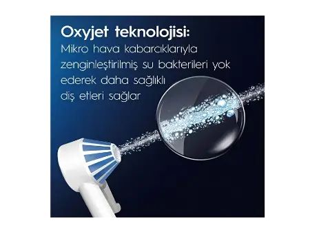Oxyjet başlığı, mikro hava kabarcıkları ile diş etlerinizi nazikçe temizler ve masaj yapar. Bu teknoloji, diş eti sağlığını destekler ve diş eti sorunlarının önlenmesine yardımcı olur.